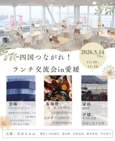 5.14(木) 11:30 | 四国つながれ!ランチ交流会in愛媛 | 生谷直美 | 愛媛県 |