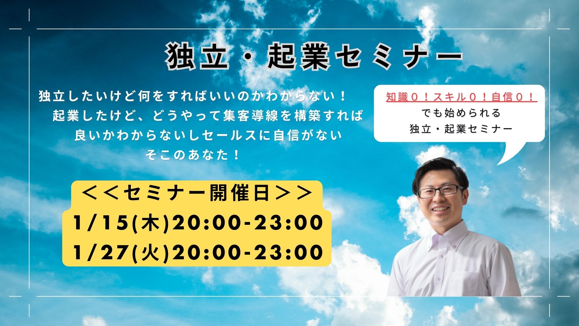 自分のカレンダーに追加 2026-01-27 20:00:00 2026-01-27 23:00:00 💰独立・起業セミナー💰〜集客やセールスが要らなくなる集客導線の構築方法〜 ページはこちら→https://link-event-x.com/index.php/node/10682 半沢和也 半沢和也 Asia/Tokyo public