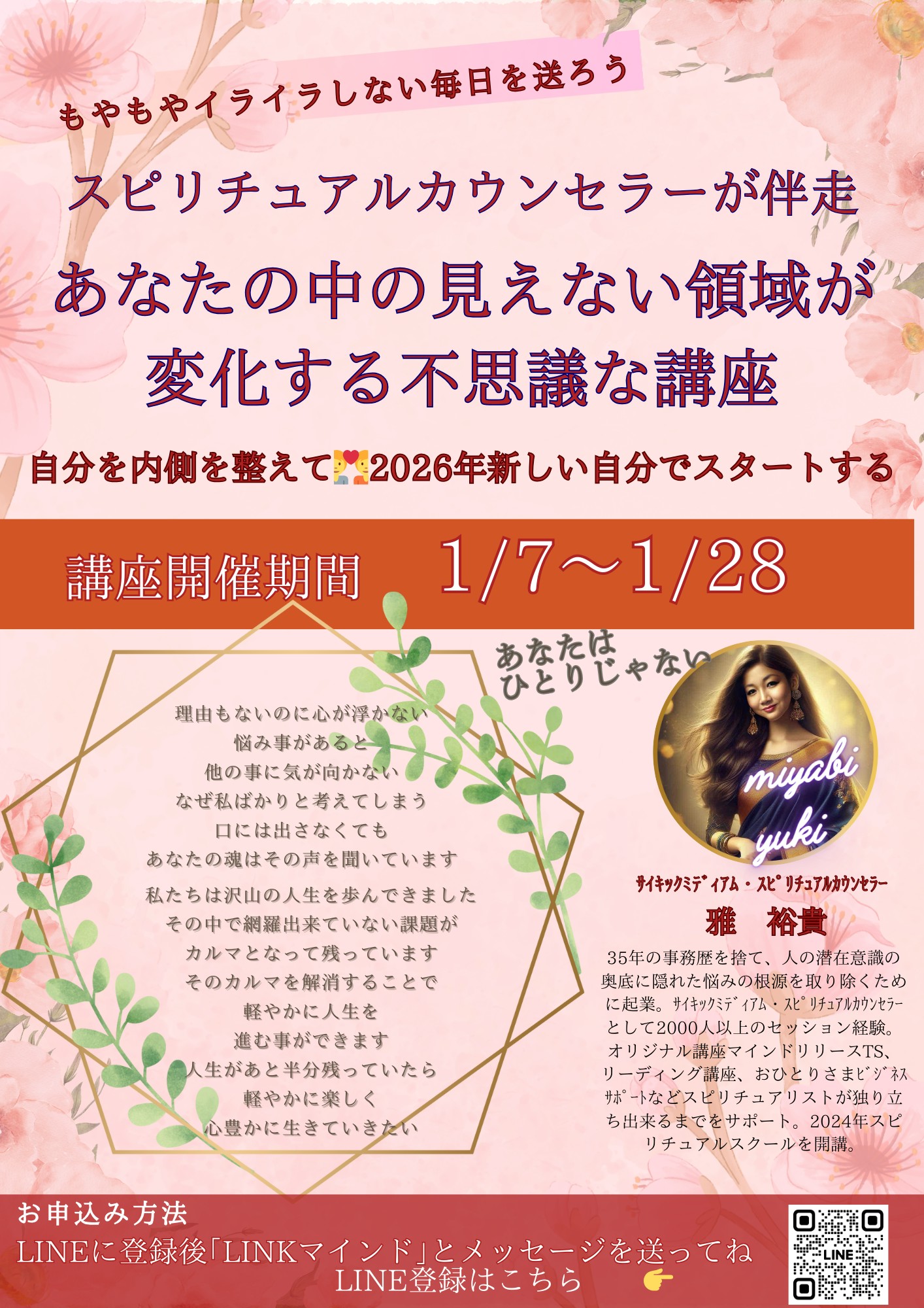 自分のカレンダーに追加 2026-01-27 13:00:00 2026-01-27 14:00:00 ◇◆守護霊とスピリチュアルカウンセラーが伴走する 🌈見えない領域が変化する不思議な講座🌈 ページはこちら→https://link-event-x.com/index.php/node/10708 雅 裕貴 雅 裕貴 Asia/Tokyo public