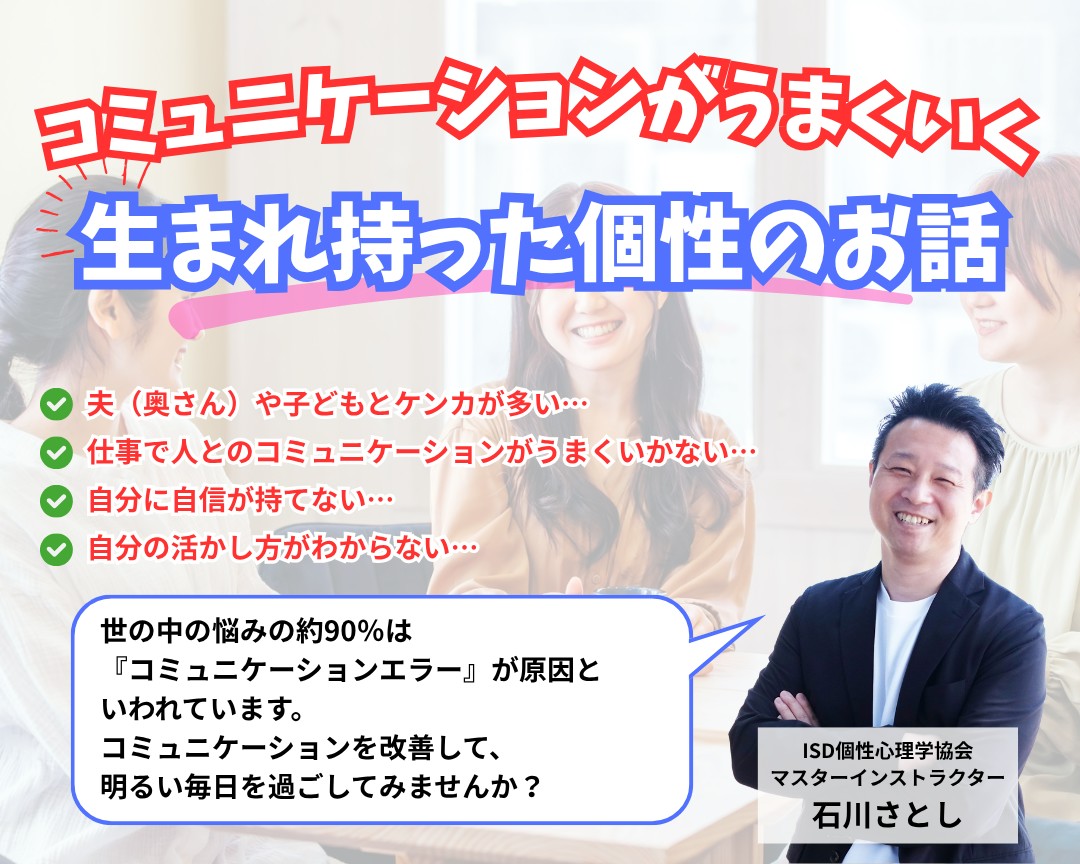 自分のカレンダーに追加 2026-01-23 20:00:00 2026-01-23 21:30:00 ✨コミュニケーションがうまくいく✨生まれ持った個性のお話♪ ページはこちら→https://link-event-x.com/index.php/node/10811 石川さとし 石川さとし Asia/Tokyo public