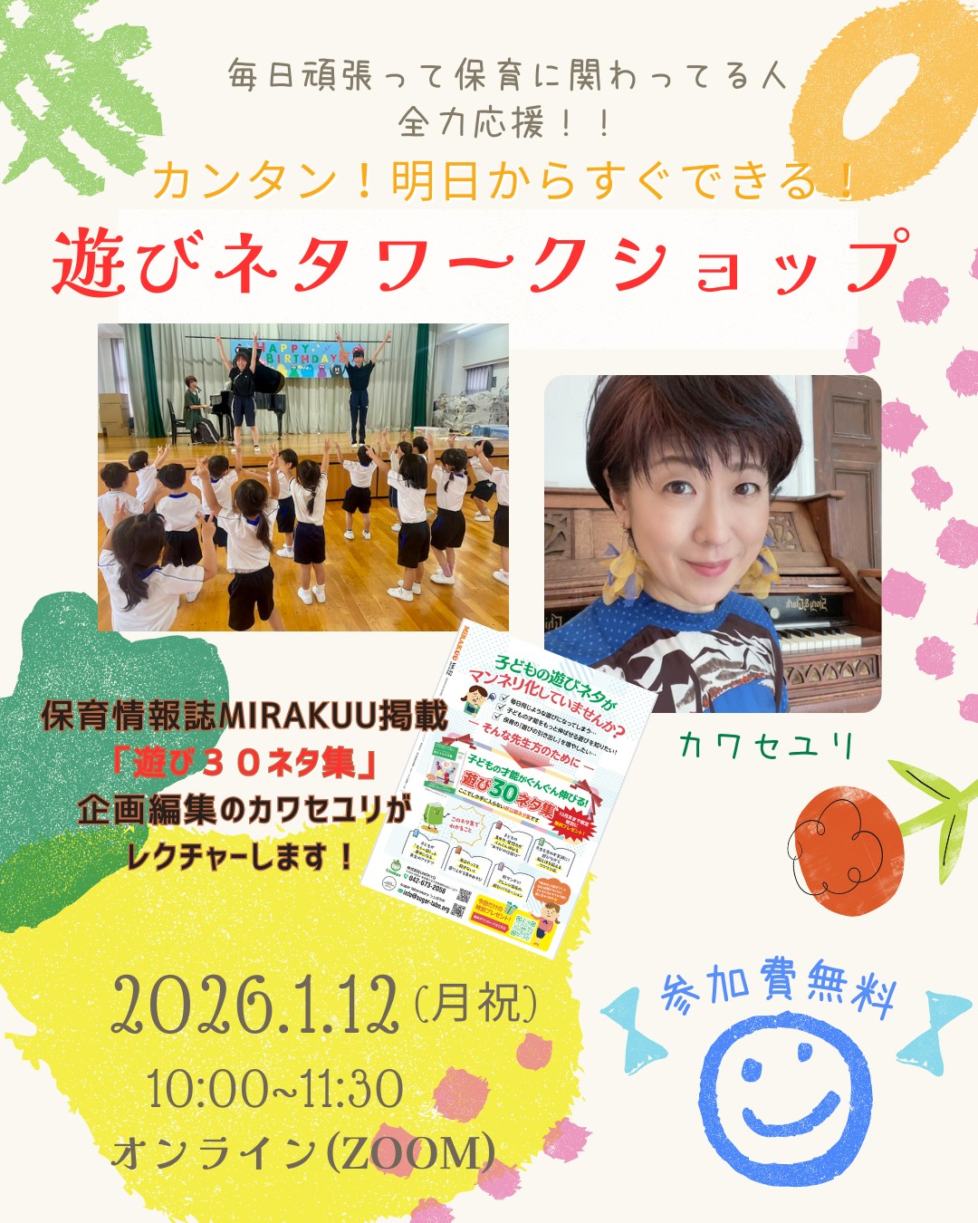 そんな保育士さん、幼稚園の先生、子育て支援関係の方、ベビーシッターさん、幼児教室の先生、保護者の皆様のお声に応えるワークショップです。
