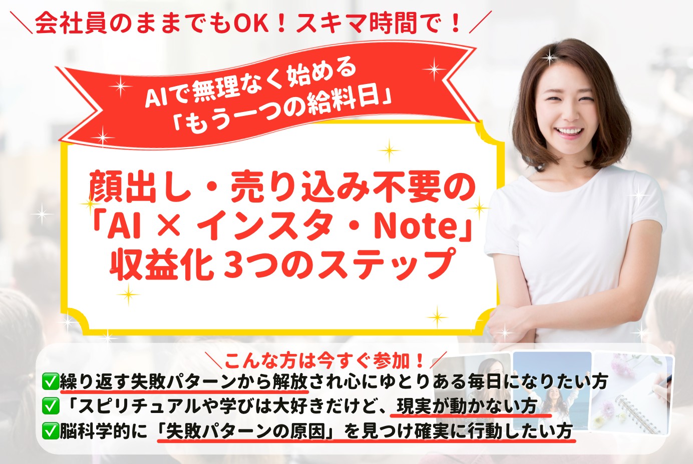 自分のカレンダーに追加 2026-01-23 14:00:00 2026-01-23 15:30:00 AIで無理なく始める「もう一つの給料日」顔出し・売り込み不要の「AI × インスタ・Note」収益化 3つのステップ ページはこちら→https://link-event-x.com/index.php/node/11107 土屋 暖響 (つちや はるき) 土屋 暖響 (つちや はるき) Asia/Tokyo public