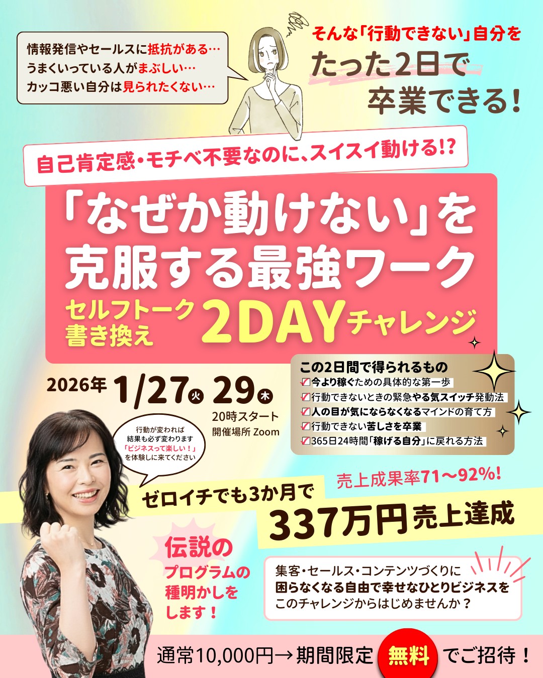 過去にはブログ1本で1950万円の売上、年間354人送客、200名規模の説明会5年連続満席などの実績を重ねる一方、コロナ禍に事業の完全停止も味わう。その再構築の過程で確立したのが、魂の価値観を言語化し、行動ブレーキを外していく現在のプログラム。