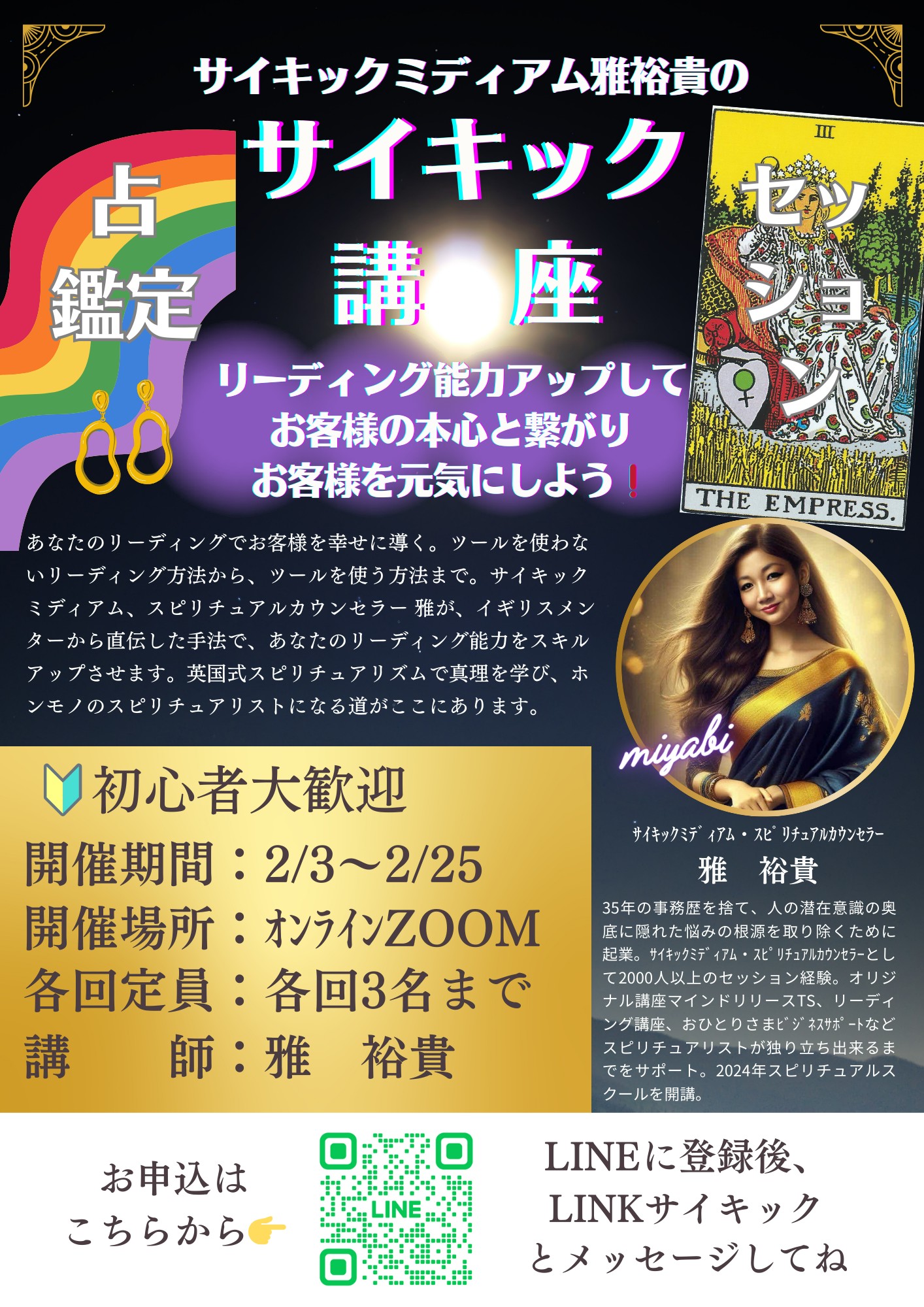 ・リーディングや目に見えない世界と繋がりたい、リーディング能力を開花し、スキルアップしたい方の講座です。無料講座を沢山受けたいというだけのかたのご参加はご遠慮願います。