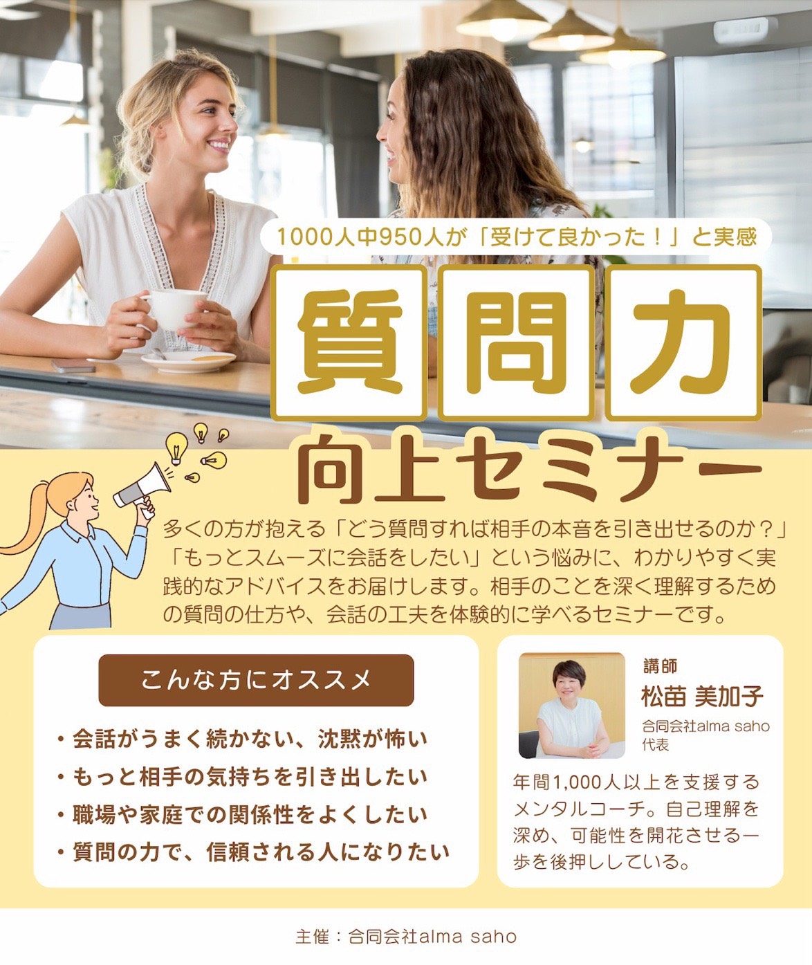 1000人中950人が「受けて良かった!」と実感した、 相手のことを深く理解するための質問の仕方や、 会話の工夫を全て教えます✨