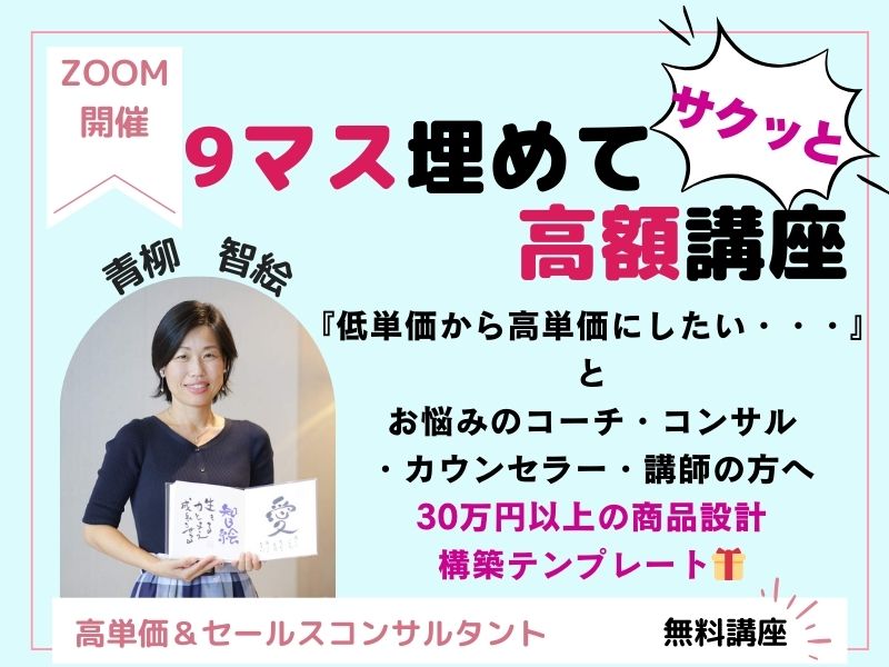 この講座では、9マスのワークをしながら、あなたの売れる商品の枠作りを1時間で行うことで、ご自身の商品作りのプロセスが分かる講座です。