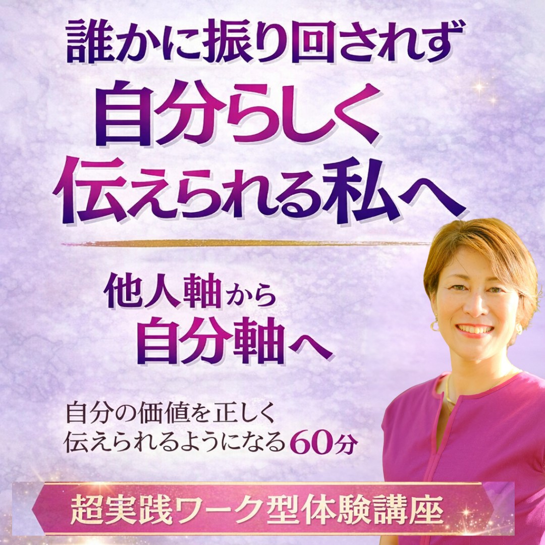 仕事・家庭・人間関係が 同時に整い始める60分 誰かに振り回されず 自分らしく伝えられる私へ ― 他人軸から自分軸へ ― 🔥超実践ワーク型体験講座