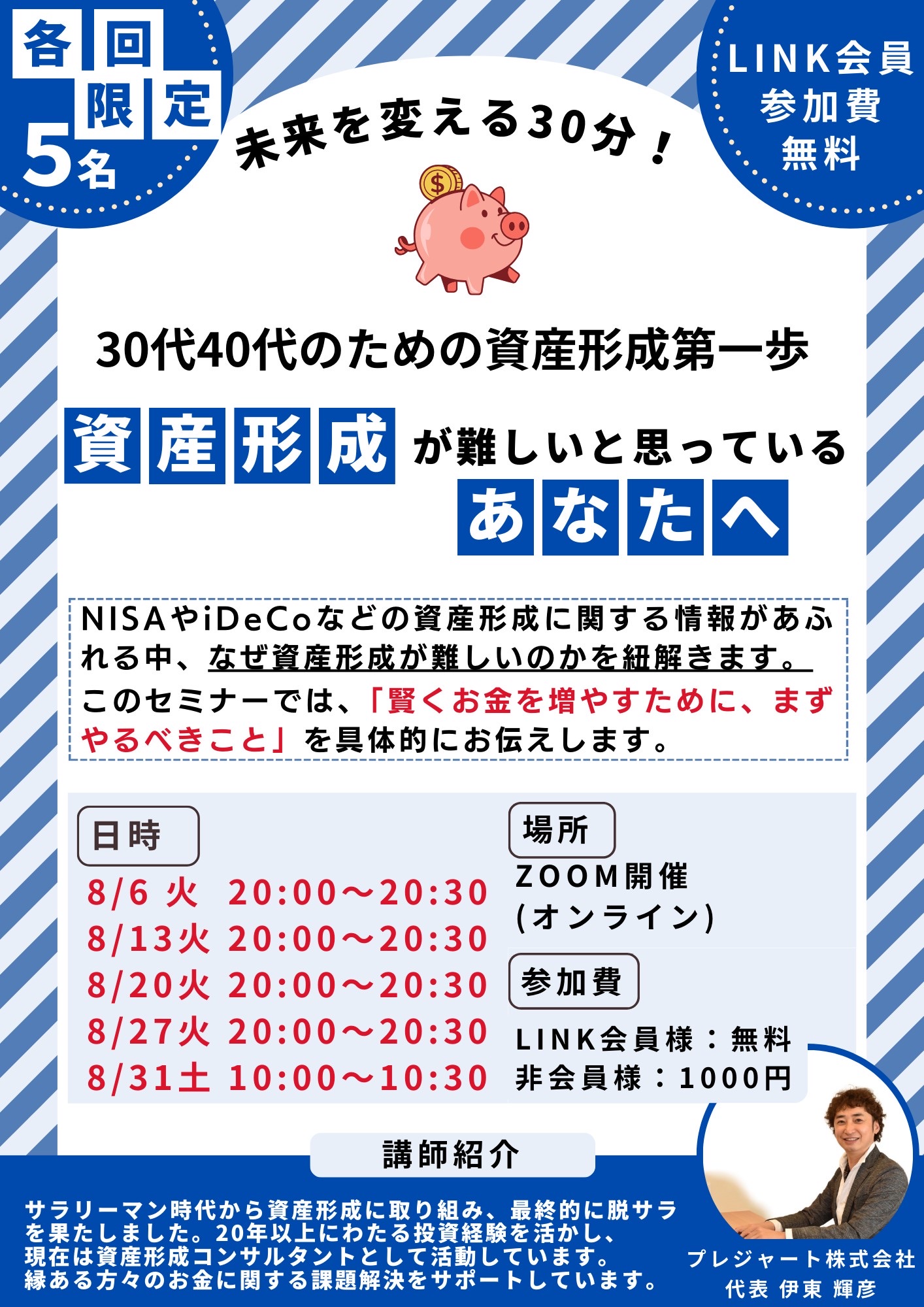 このセミナーでは、資産形成がうまく進まない原因を一緒に考え、賢くお金を増やすための最初の一歩を踏み出すためのヒントを提供します。