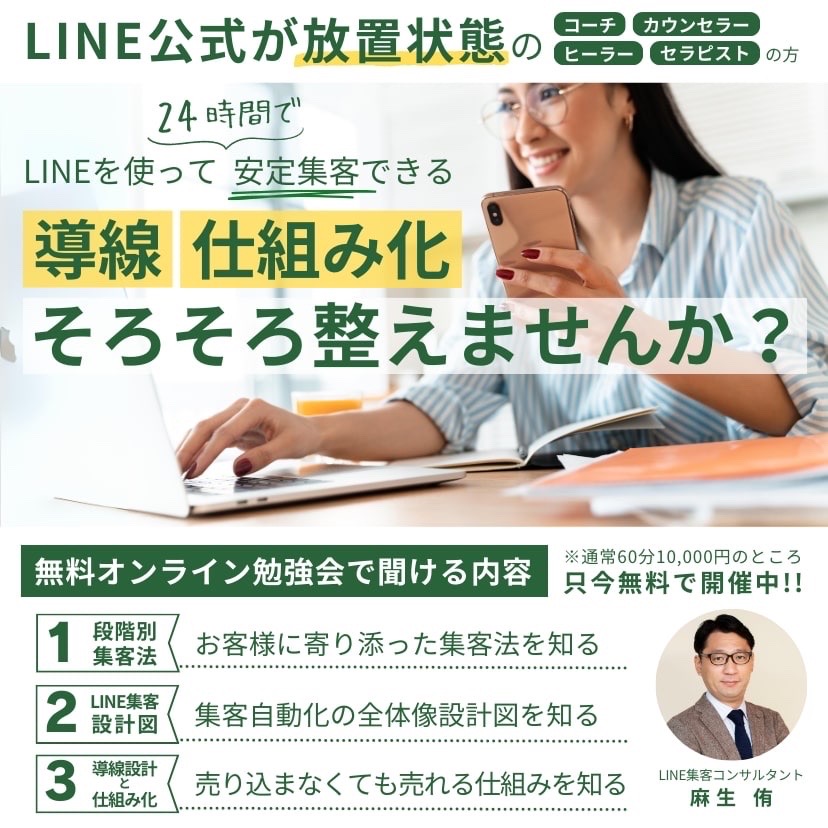 ⬇️お申し込みは下記LINEに登録後、「LINE集客オンライン勉強会」へ進んでお申し込みください。LINE登録で「LINE集客の教科書(PDF)」も差し上げています🎁