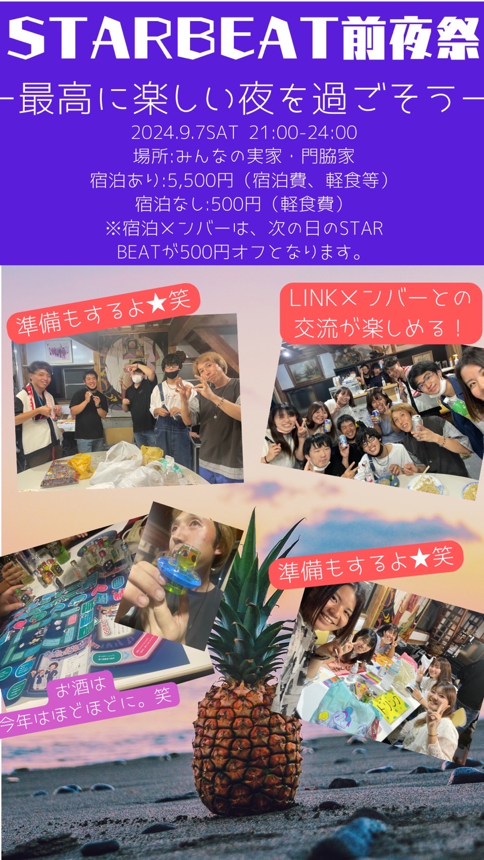 宿泊あり5,500円(宿泊費、軽食代) 宿泊なし500円(軽食のみ) ※宿泊メンバーは、次の日のSTAR BEATが500円オフとなります。