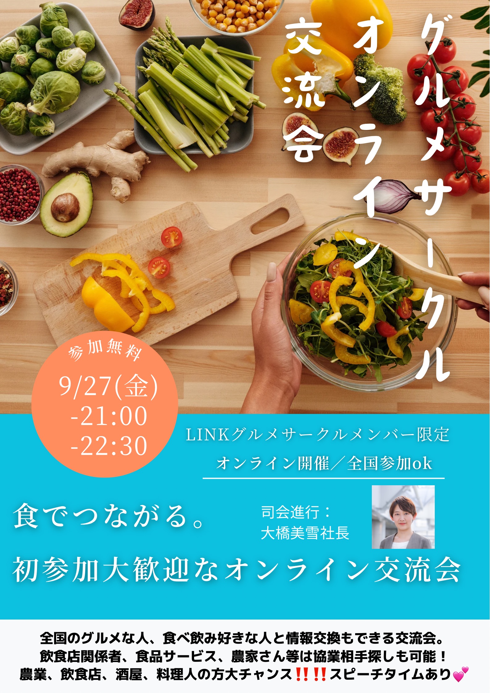 少人数で全国のグルメ好きな人と情報交換もできる交流会。飲食店関係者、食品サービス、農家さん等は協業相手探しも可能!