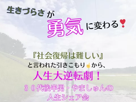 😢「生きづらさ」が「勇気」に変わる!😆 『社会復帰は難しい』と言われた引きこもり☝️から、 人生大逆転劇をした男の人生シェア会 ~明日からの自分を後押しするシェアタイム付き~