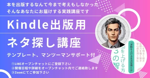 「わたしが本を出せるわけがない!」「本を出版なんて今まで考えもしなかった!」と思っているあなたへ。 Kindle出版に関する疑問はすべてお答えします。 「ネタがなくても絶対に出版できる!あなた専用のネタ探し実践講座開催」