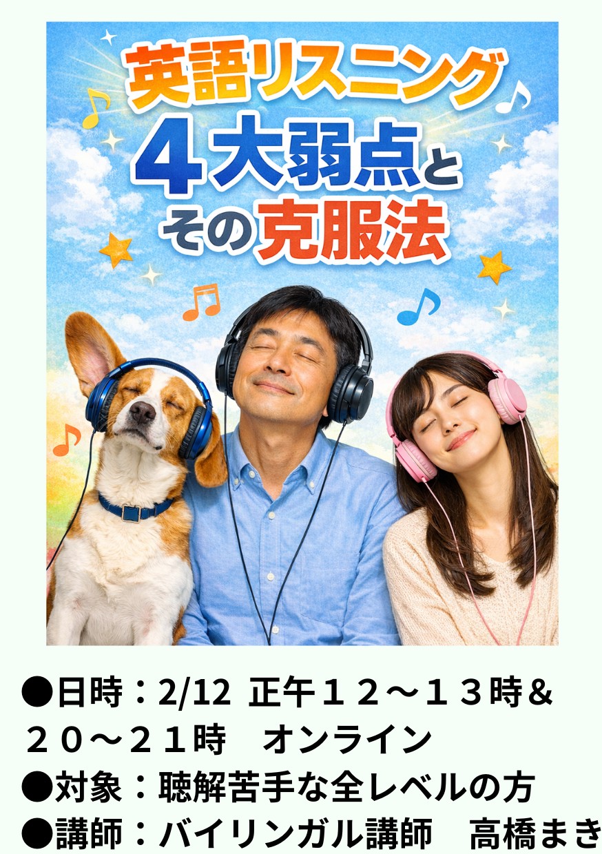 自分のカレンダーに追加 2026-02-12 20:00:00 2026-02-12 21:00:00 英語リスニング 4大弱点とその克服法 ページはこちら→https://link-event-x.com/node/11984 高橋まき 高橋まき Asia/Tokyo public
