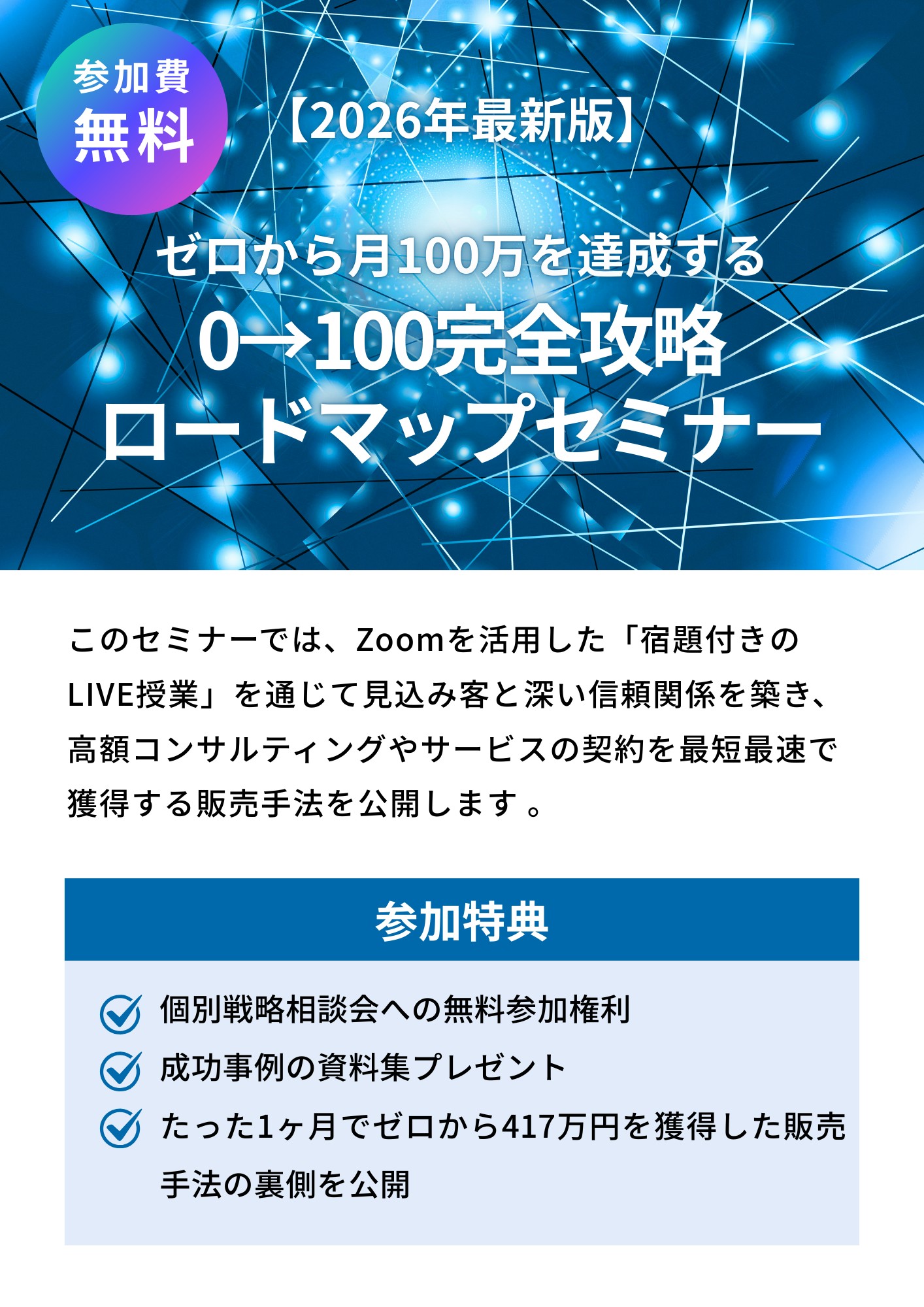 このセミナーでは、ZOOMを活用した「宿題付きのLIVE授業」を通じて見込み客と深い信頼関係を築き、高額コンサルティングやサービスの契約を最短最速で獲得する販売手法を公開します 。