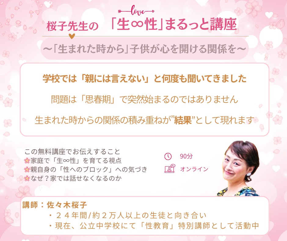 自分のカレンダーに追加 2026-03-06 13:00:00 2026-03-06 14:30:00 🌸桜子先生の🌸 「生∞性」まるっと講座 思春期になる前に… 恥ずかしさを超えて、子どもに一生届く贈り物を ページはこちら→https://link-event-x.com/node/12227 佐々木 桜子 佐々木 桜子 Asia/Tokyo public