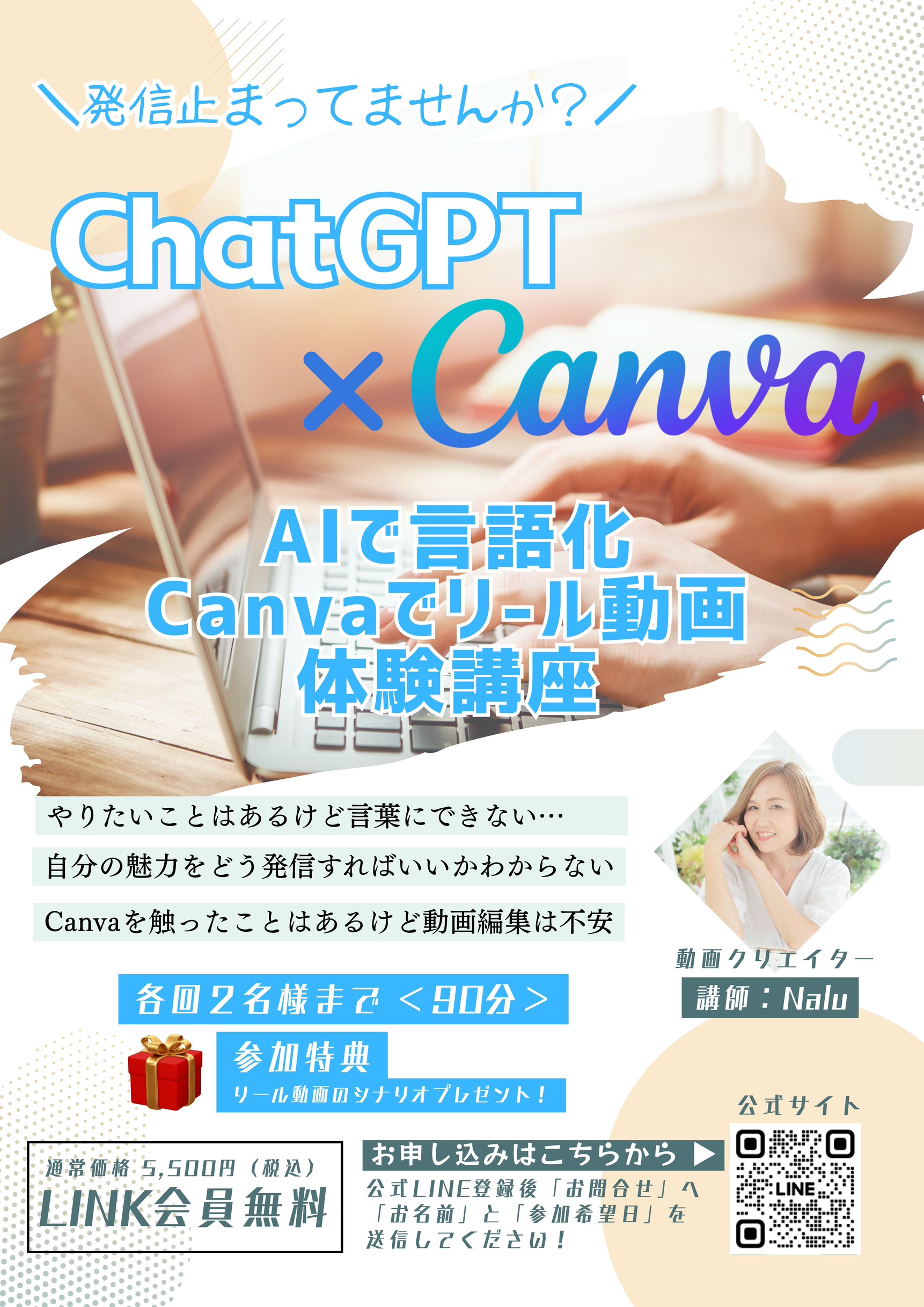 自分のカレンダーに追加 2026-03-25 20:00:00 2026-03-25 21:30:00 🌈「私にもできた!」 chatGPTで言語化 × Canvaで魅せるリール体験 ページはこちら→https://link-event-x.com/node/12648 Nalu(なる) Nalu(なる) Asia/Tokyo public