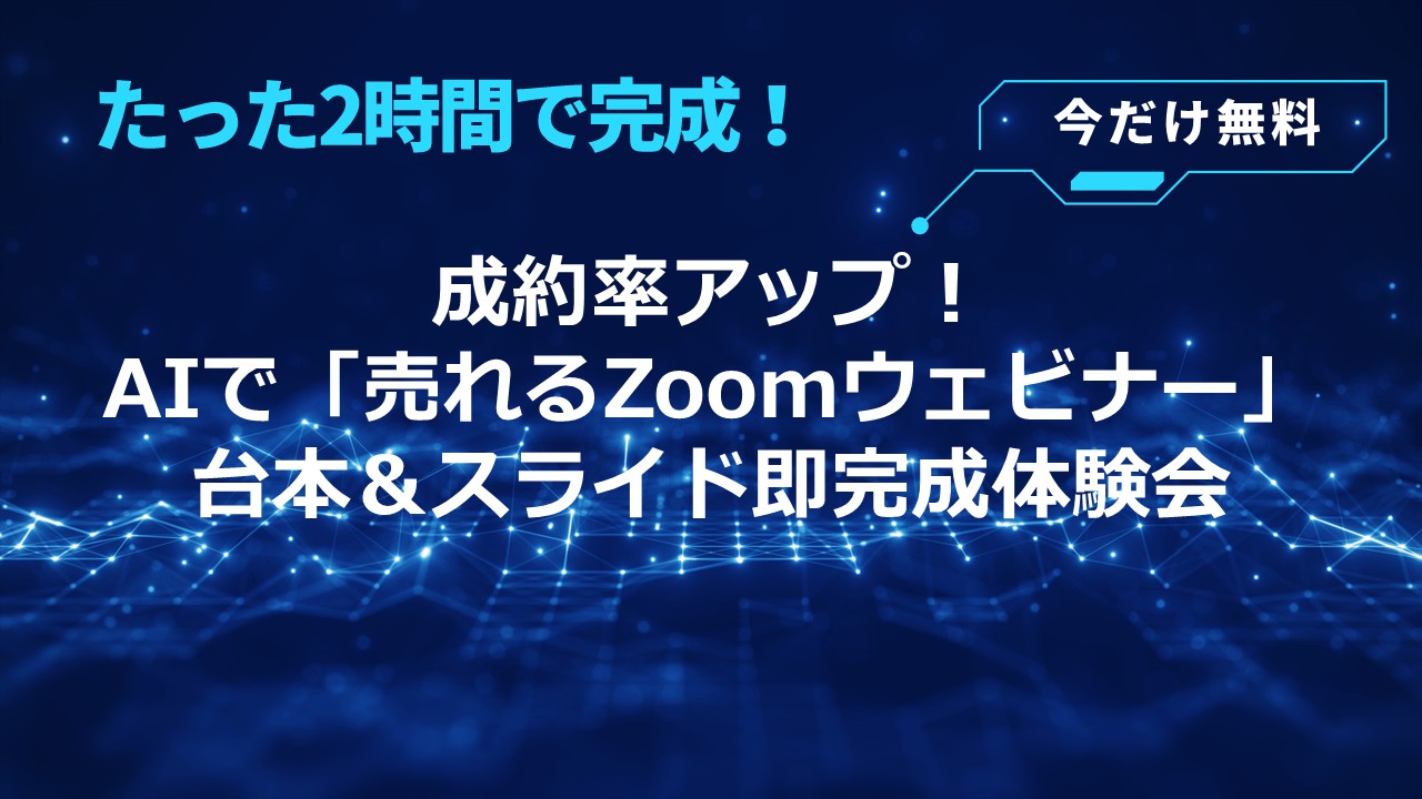 自分のカレンダーに追加 2026-03-04 17:00:00 2026-03-04 19:00:00 成約率アップ!AIで「売れるZoomウェビナー台本&スライド」即完成体験会 ページはこちら→https://link-event-x.com/node/12744 亀井賢二郎 亀井賢二郎 Asia/Tokyo public