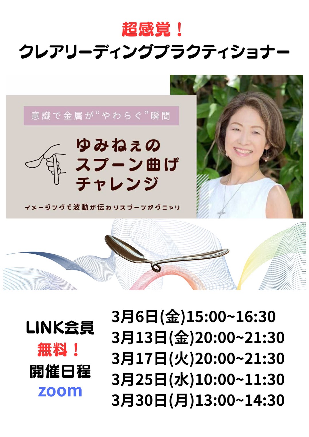 自分のカレンダーに追加 2026-03-30 13:00:00 2026-03-30 14:30:00 超感覚!クレアリーディング基礎講座~スプーン曲げチャレンジ~ ページはこちら→https://link-event-x.com/node/12751 兼平由美子(ゆみねえ) 兼平由美子(ゆみねえ) Asia/Tokyo public