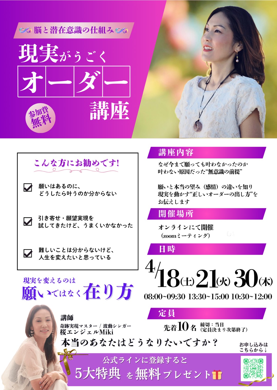 願望実現・潜在意識をテーマに、「在り方が現実にどう影響するのか」を自身の体験を通して伝えている。