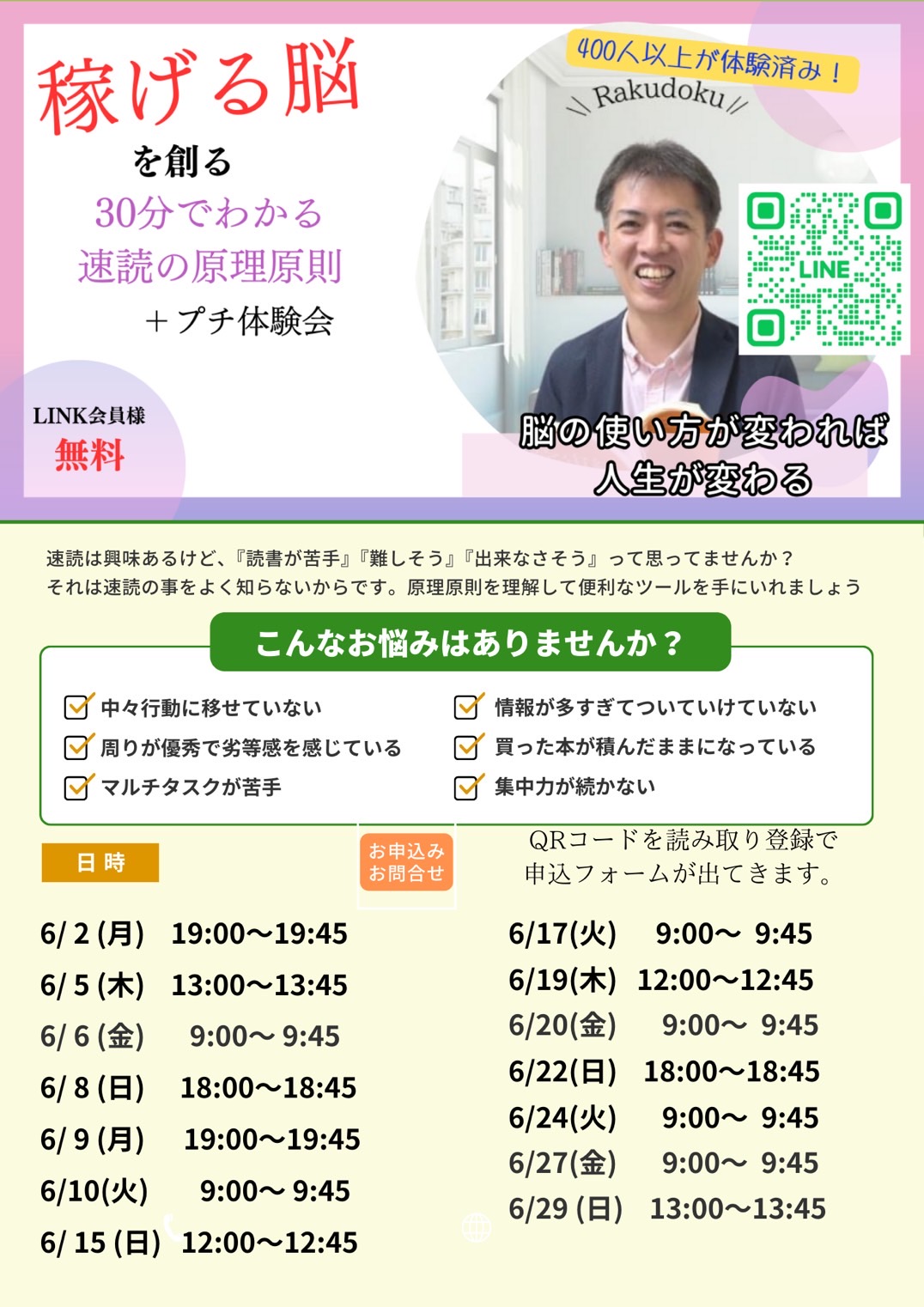 自分のカレンダーに追加 2025-06-17 09:00:00 2025-06-17 09:45:00 稼げる脳を作る! 30分で分かる速読の原理・原則+プチ体験講座 ページはこちら→https://link-event-x.com/node/5135 前田英志(まえちゃん) 前田英志(まえちゃん) Asia/Tokyo public