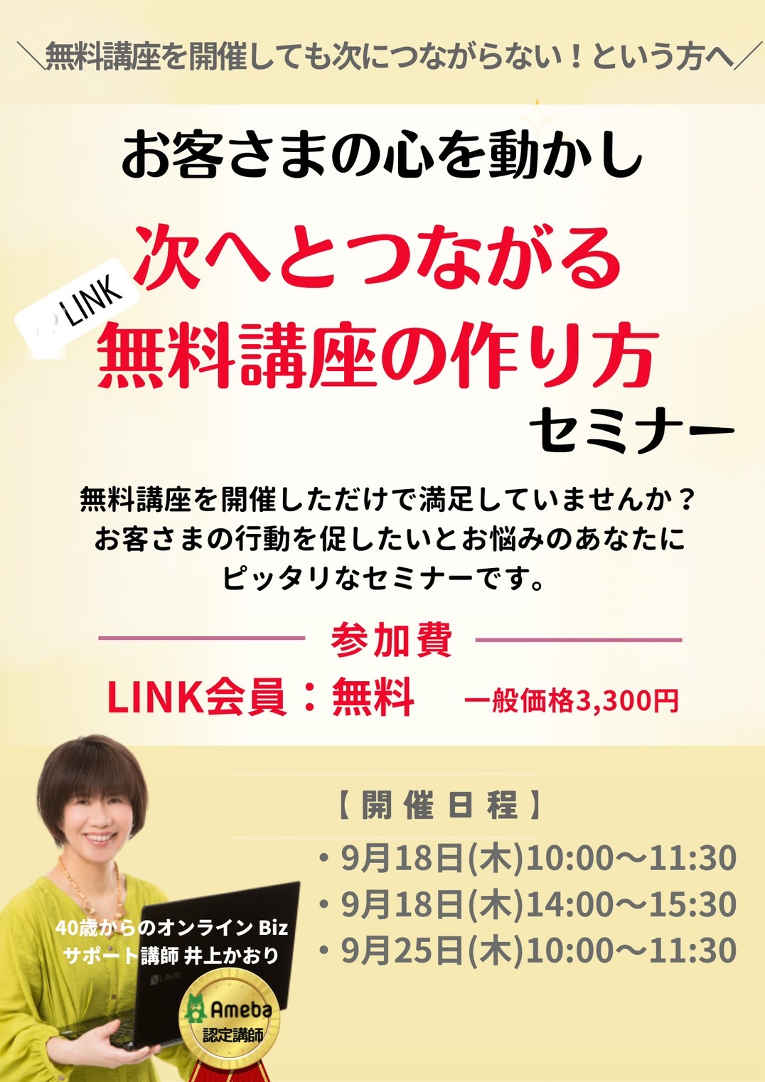 自分のカレンダーに追加 2025-09-18 14:00:00 2025-09-18 15:30:00 お客さまの心を動かし、次へとつながる無料講座の作り方セミナー ページはこちら→https://link-event-x.com/node/7560 井上かおり 井上かおり Asia/Tokyo public