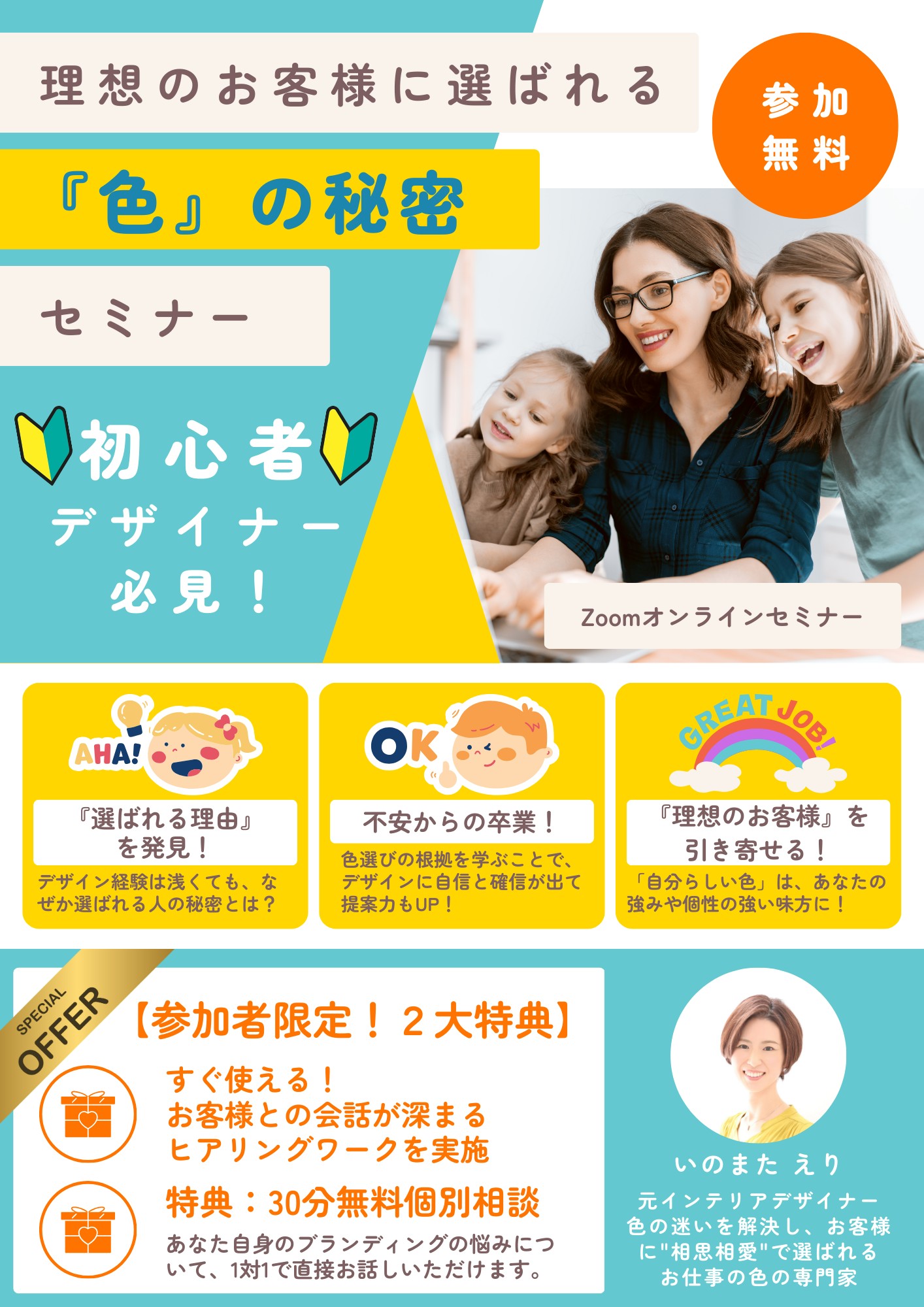 自分のカレンダーに追加 2025-09-30 10:00:00 2025-09-30 10:30:00 【初心者ママデザイナー必見!】自信がつく!理想のお客様に選ばれる『色』の秘密セミナー ページはこちら→https://link-event-x.com/node/7597 いのまた えり いのまた えり Asia/Tokyo public