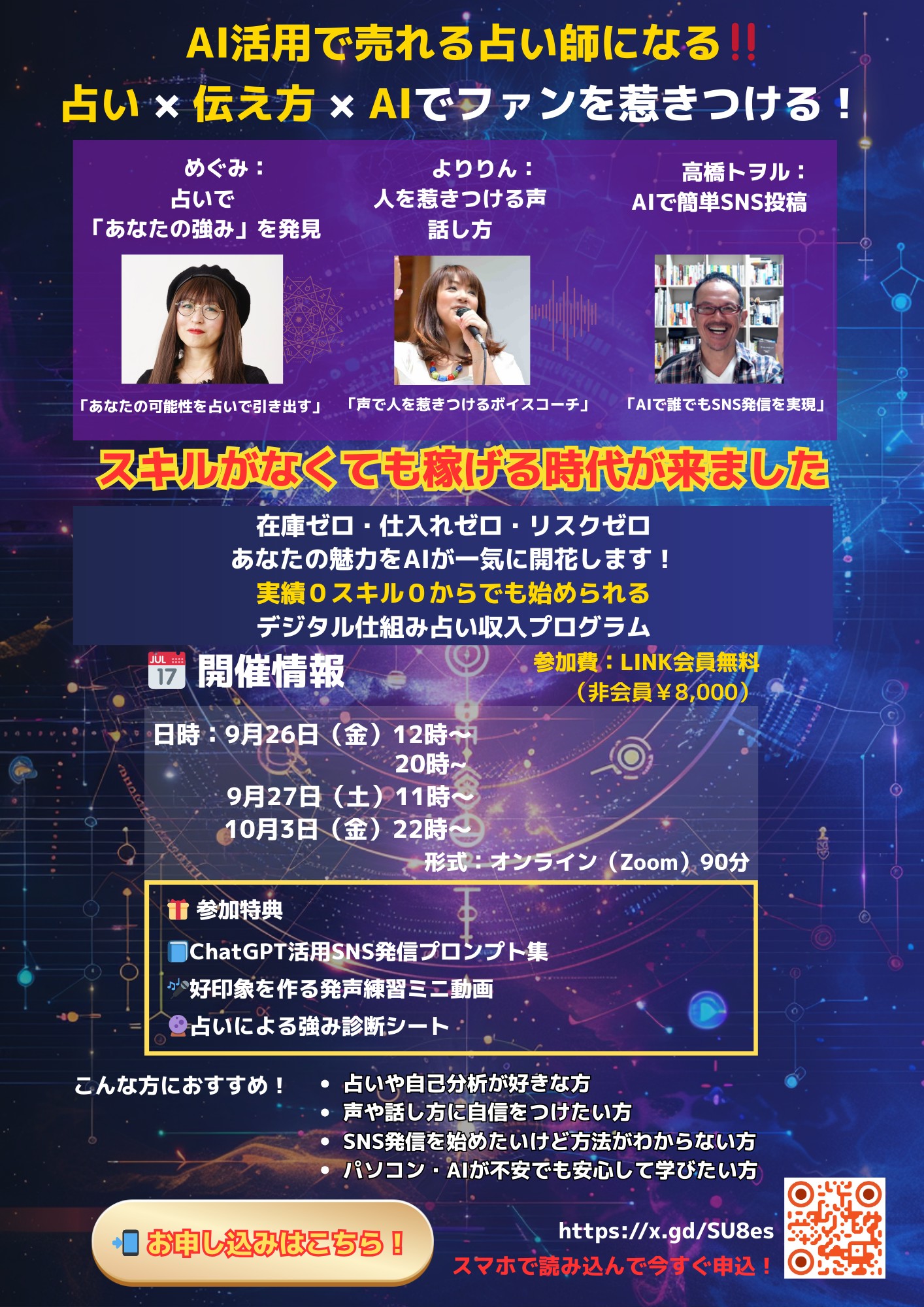本講座では3人の専門家がコラボして、占いで強みを発見し、発声で人を惹きつけ、AIを活用したSNS集客の方法を体験できます。