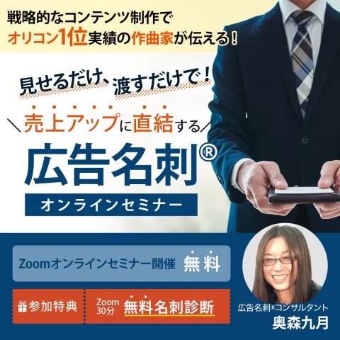 戦略的なコンテンツ制作で オリコン1位実績の作曲家が伝える ! 見せるだけ、渡すだけで!【売上アップに直結する広告名刺®️】オンラインセミナー