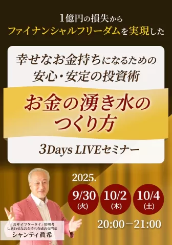 1億円の損失 から ファイナンシャルフリーダム を実現した 幸せなお金持ちになるための 安心・安定の投資術 お金の湧き水のつくり方 3Days LIVEセミナー